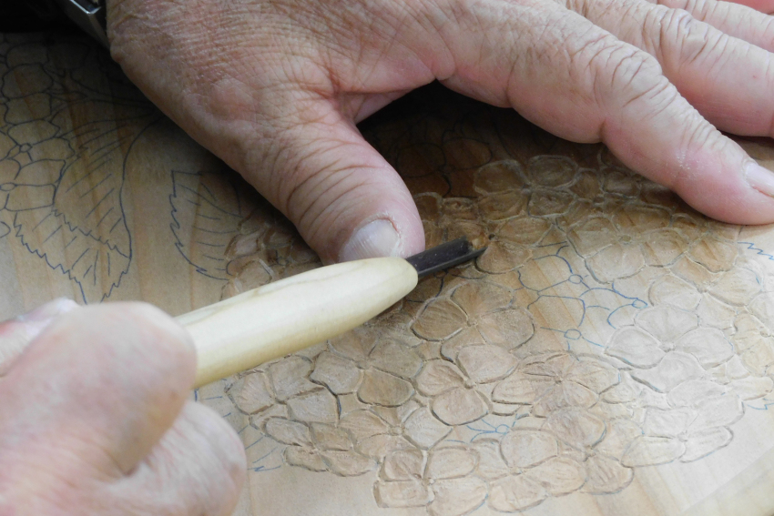 最初は、盆に文字を彫り、刀の使い方を覚えます。次に野菜や果物を経て、だんだんと細かいモチーフに進みます。