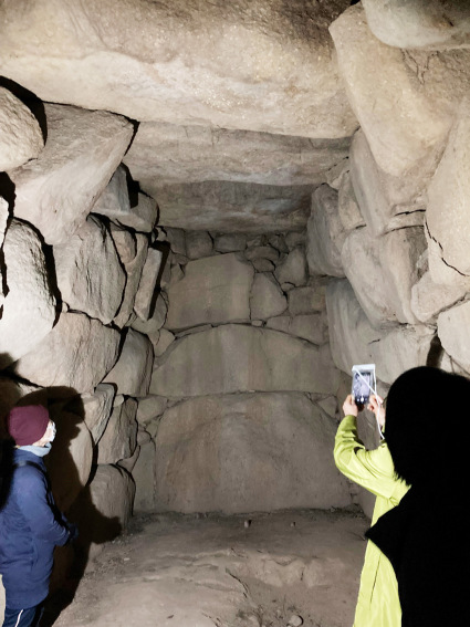 写真1枚目 前回(2023年)のフィールドワークの様子。緑山古墳群の横穴式石室に入室