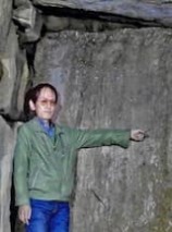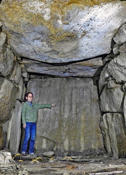 写真2枚目 高さ2.3mの石室の新池大塚古墳(岡山市北区新庄)と講師の和気さん。和気さんの古墳講座は、小学校や公民館などでも好評。