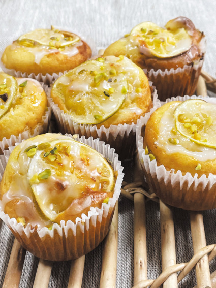 仕上げにレモンをのせ、レモンアイシングとピスタチオをかけます。