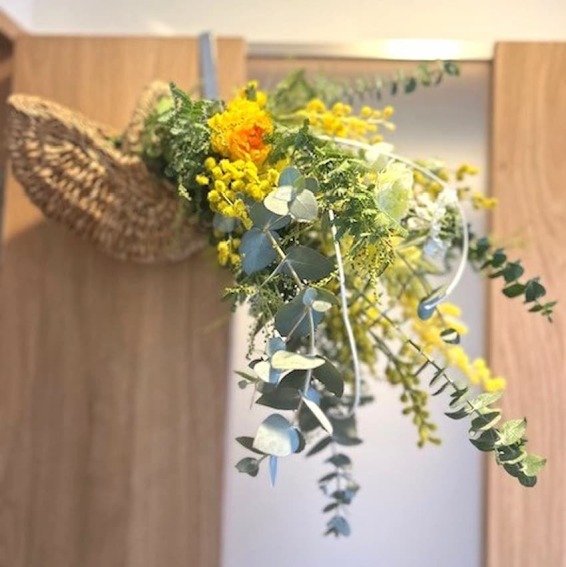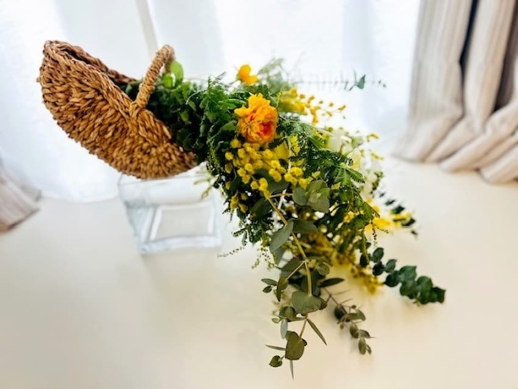 旬の植物とともに、ミモザのスワッグを作り、カゴにセットします。