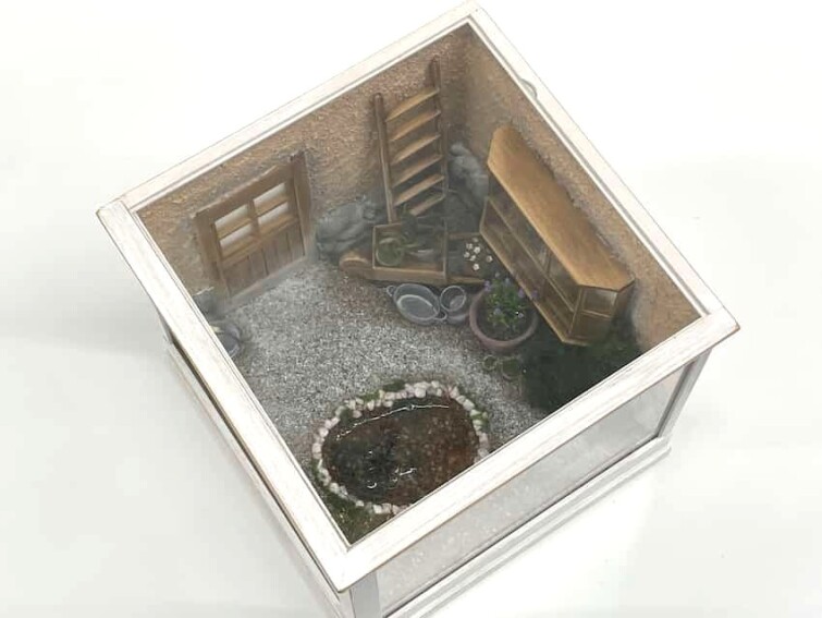 壁や出窓は、木や紙で作って組み立て、池の水はレジンで表現。