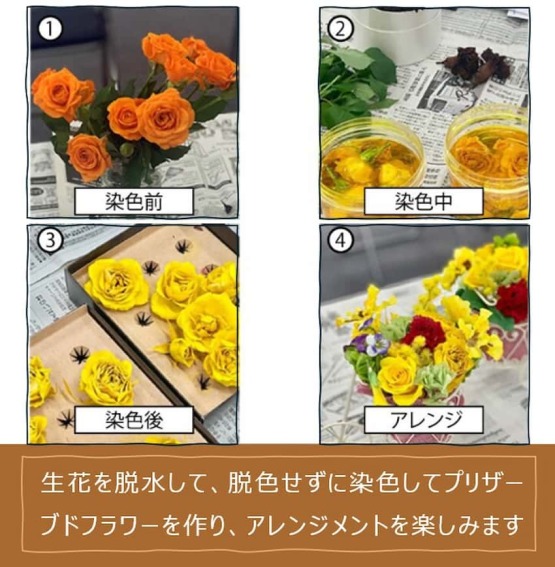 この講座では、生花を脱水し、脱色せずに染色するプリザーブドフラワーの作り方を習います。