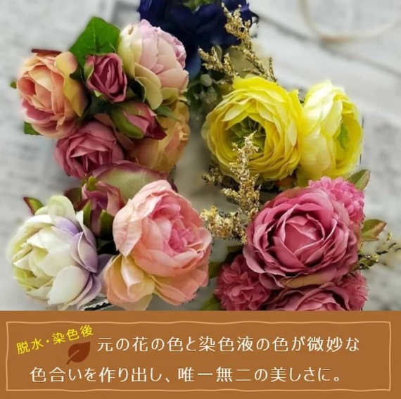 元の花の色と染色液の色が微妙な色合いを作り出し、美しいと評判。