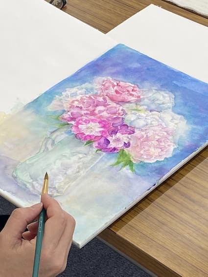 絵の基本のデッサン、または、淡く鮮明な色使いの透明水彩を習える講座です。