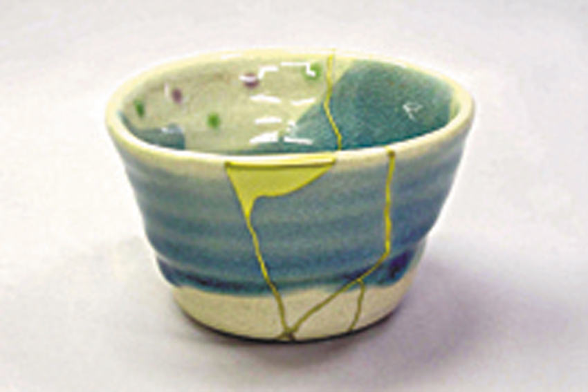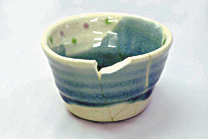 割れた部分を継ぎ、欠けた部分を成形し、金の化粧を施して、器を修繕する技法です。