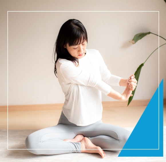 ヨガよりも楽なポーズで、凝っている部分を自分で探し、全身の関節を緩めます。