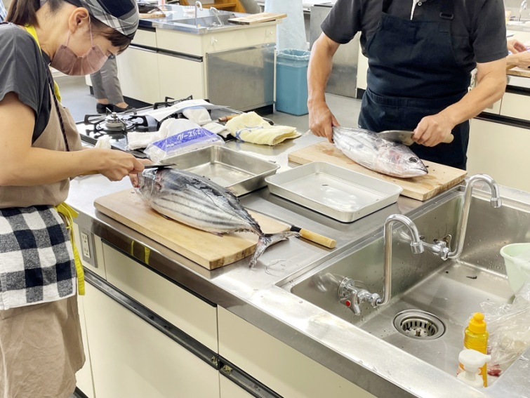 1人ずつ旬の魚をおろし、刺身にする教室です。
