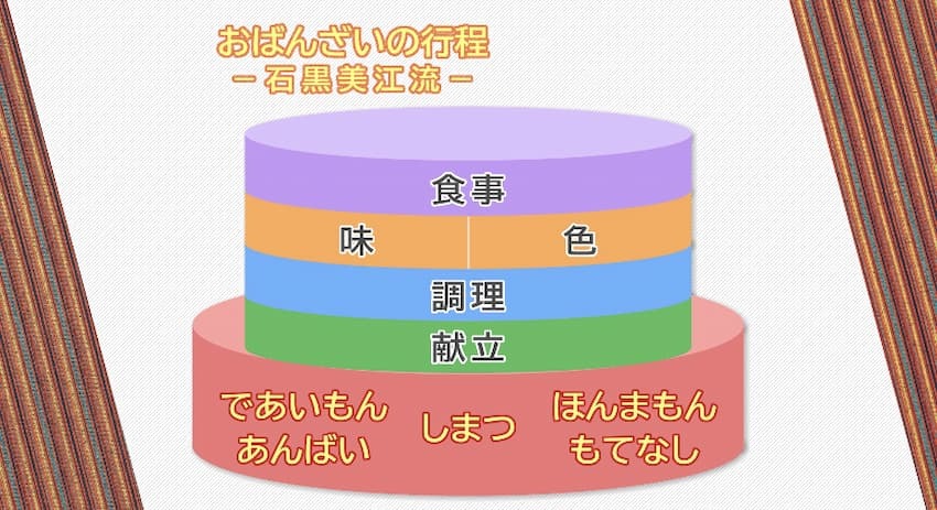 おばんざいは、ただの料理ではありません。食材の使い方、調理の仕方、食べ方を中心とした一つの食の様式です。同時に毎日の暮らし方や生き方とも関連しています。その根幹にあるのは先に申し上げた五つの精神、であいもん、もてなし、ほんまもん、あんばい、しまつなのです。全てはここから始まっています。これらの精神が基になって各行程の中に様々な知恵として生まれ育ち、長い歴史の中で洗練され、形となったものがおばんざいなのだと思います。
