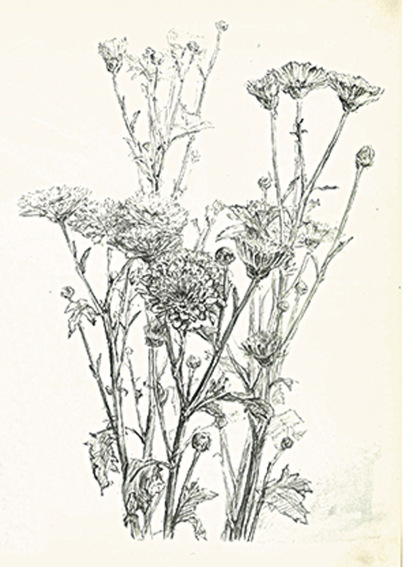 右:講師が依頼を受けて描き、美術誌に掲載されたデッサンの作品「小菊」